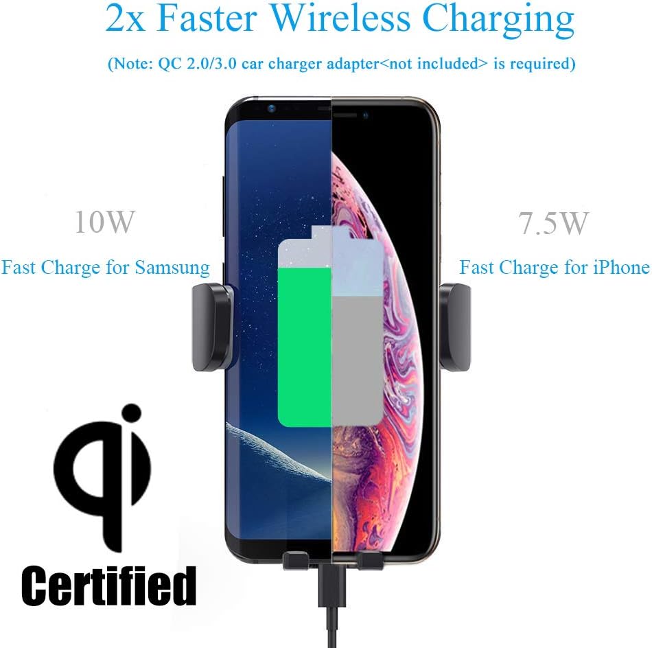 A: 1. Quick Charge 2.0/3.0 charger adapter is highly recommended(Not included). 2. Turn off phone screen while wireless charging. 3. Try to adjust the bottom bracket to make the phone at the wireless charging Inductive center.